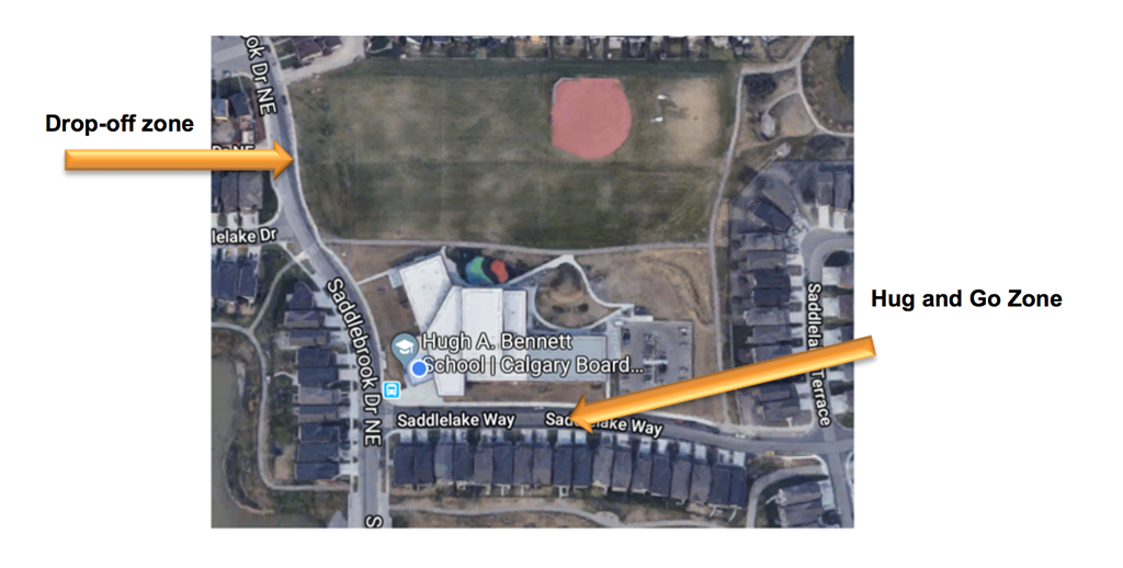 We asking parents to utilize the hug and go areas on Saddlelakle Way between 7:45 and 8:00 am. Alternatively, you may park along Saddlebrook Drive past the crosswalk to drop your child off (please note that you may not park in the bus zone). Students can then proceed directly to the playground to play or to their designated door to go into class for soft start. If you pull up to the hug and go zone and it is full, proceed down the street and do a loop around the block and try again to avoid the very dangerous practice of double parking.